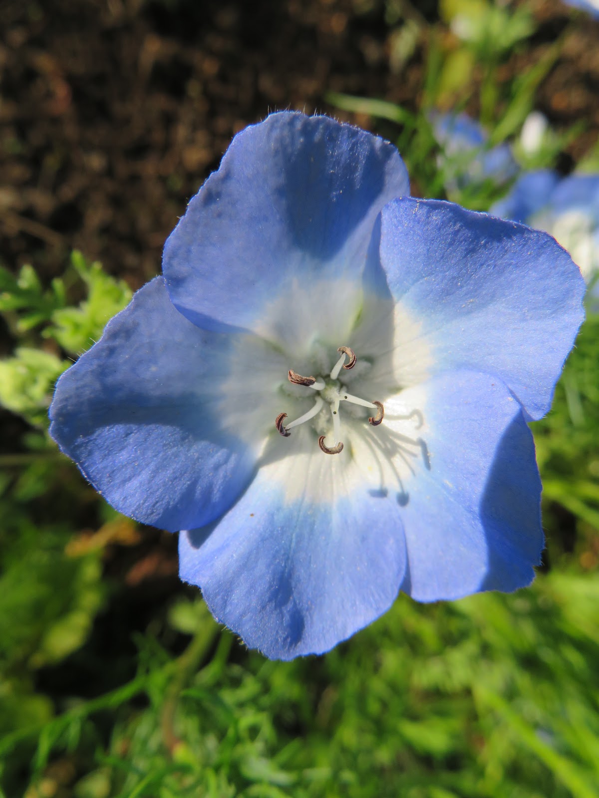 Upward facing, cup-shaped, 5-lobed, blue flowers (to 1.5” wide) with light blue to white centers bloom profusely in cool weather. Many are ornamental plants like the forget-me-not (Myosotis sylvestris), baby blue eyes (Nemophila menziesii), lungwort (Pulmonaria spp). Baby blue eyes are beautifully breathtaking, but I'am not talking about the eyes of a newborn child.